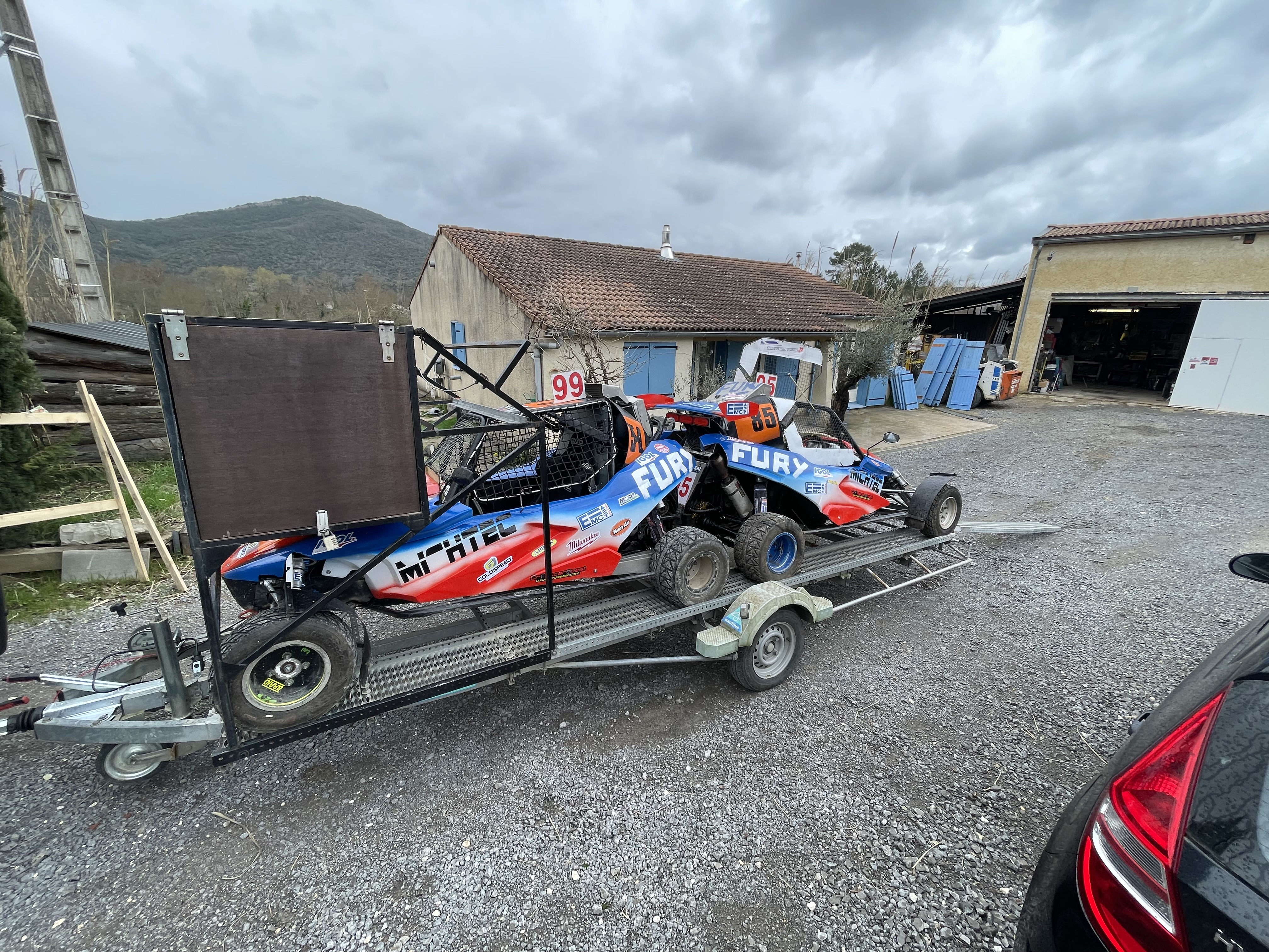 Bonjour je vends ma remorque qui peut monter deux kart cross elle a été entièrement réviser l’hiver dernier, feux led et attache remorque avec amortisseur neuf je la vend a 2000€