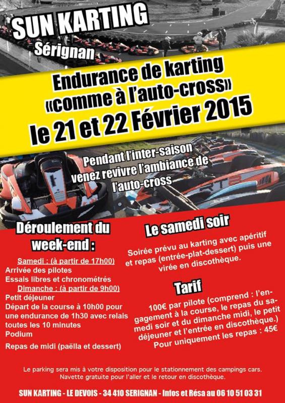 <br>Je souhaite organisé un weekend avec tous les gens de l’auto Cross pour faire une endurance karting de 2h00 par équipes de 2 ou 3 pilotes ou un grand prix en fonction du nombre de participant.