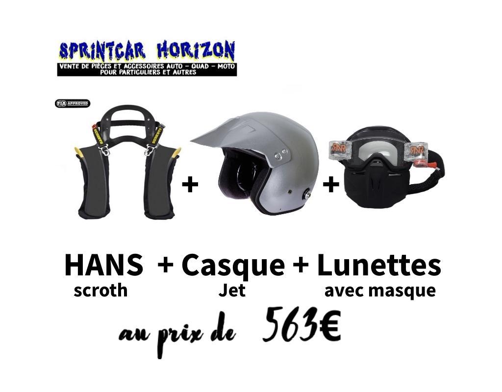 Pack contenant Système HANS Scroth + Casque Jet homologué FIA + Lunettes avec roll-off et masque de protection .