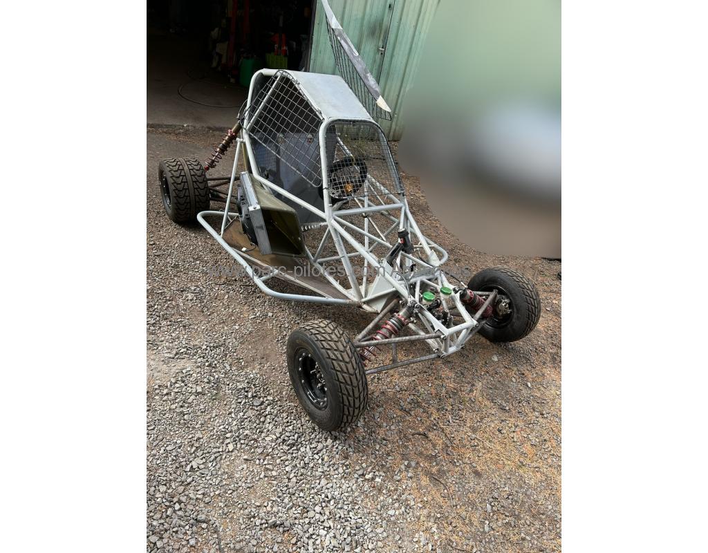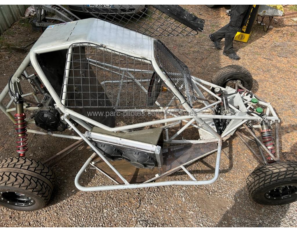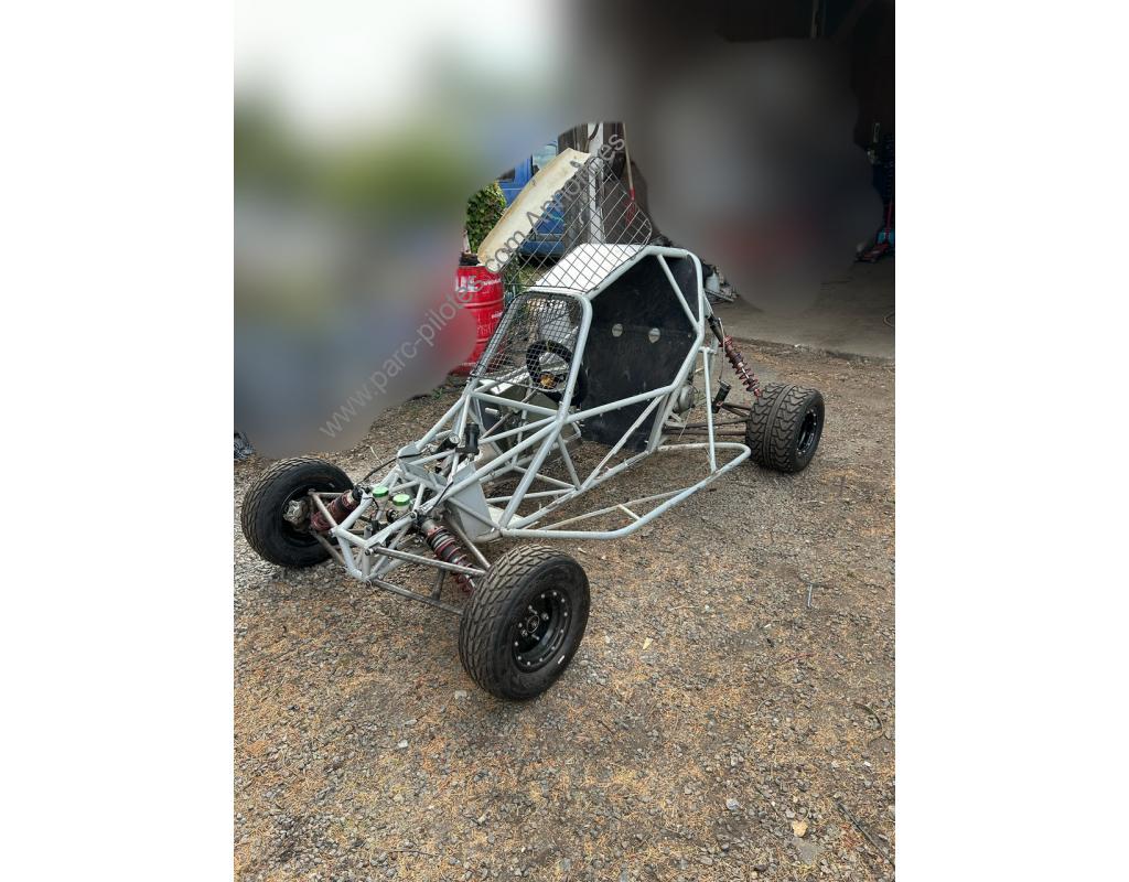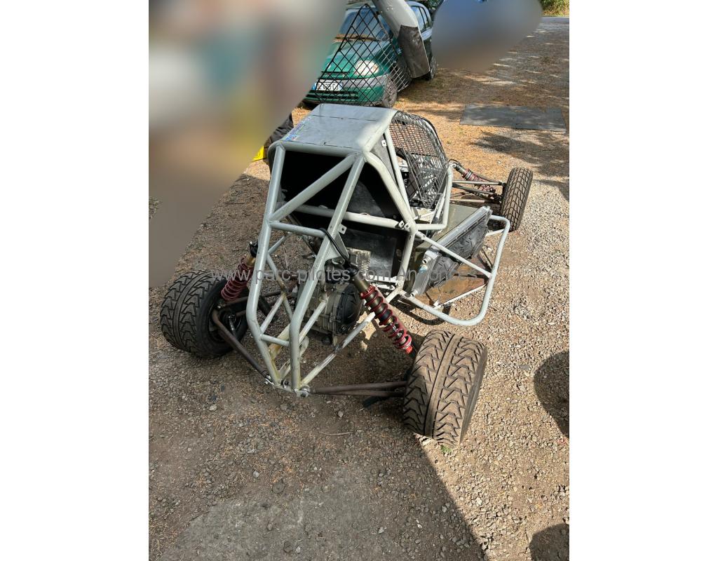 <br>Châssis sur roues, pivots, moyeux, roulements, disques de freins avant et arrière, étrier avant et arrière, maître cylindre avec bocal de frein, biellettes de direction, crémaillère, colonne de direction, volant, levier de vitesse alu, grilles latéral et grille avant, radiateur avec ventilo, pédalier, pont arrière camotos nouvelles génération, couronnes et disques haute performance,, carrosserie, 4 nez avant dont 2 neufs, intérieur carbone complet, 4 jantes goldspeed et pneus mi usure.