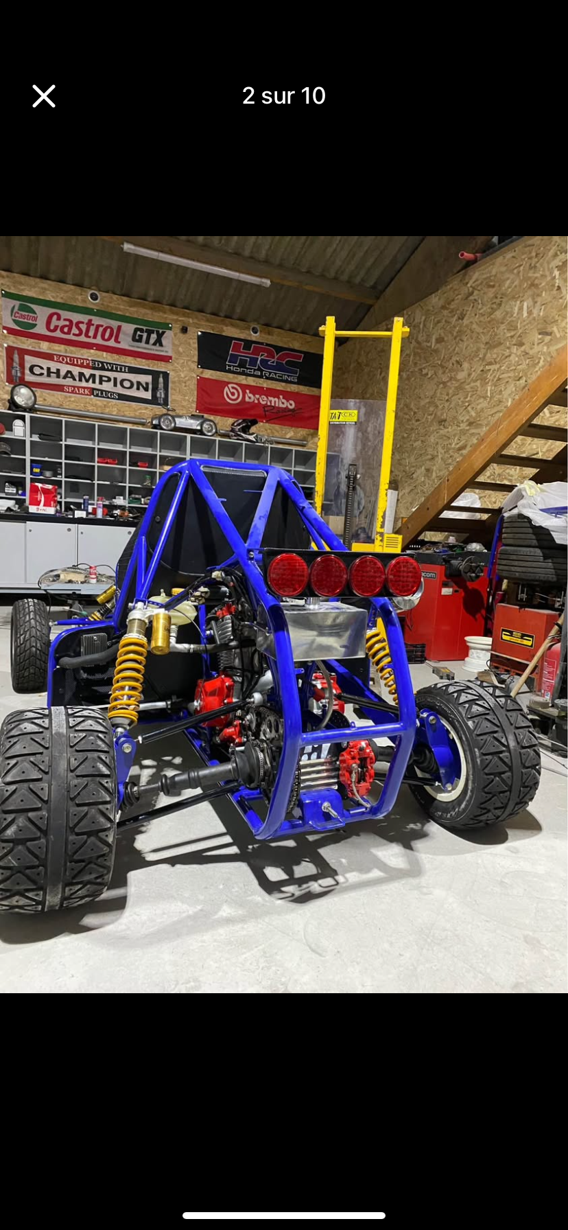 Avec en pièces de secours : trains avant, demis trains arrière, barres anti-encastrement 4 roues (pneu Golspeed)2 avant 2 roues arrières Braid,carénages de rechange et tout les moules étrier,radiateur,rotules,cdi,régulateur,bobine,chaînes,amortisseurs …enfin tous le nécessaire pour pour courir sereinement.